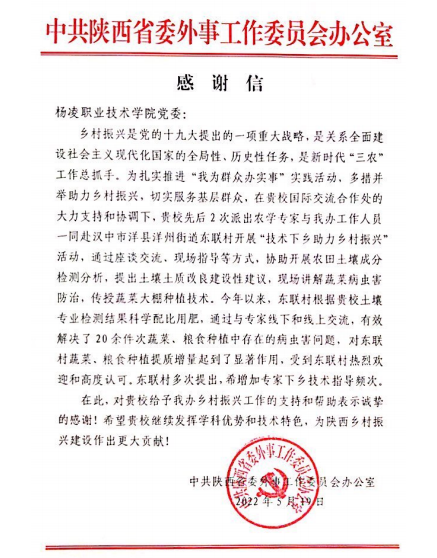 近日,学校收到中共陕西省委外事工作委员会办公室的感谢信。在信中,省委外事办对学校在乡村振兴工作中给与的支持和帮助表示诚挚的感谢。
