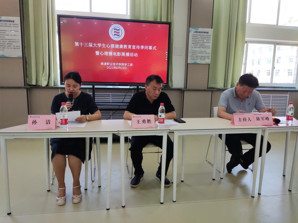 6月23日,学校第十三届大学生心理健康教育宣传季闭幕式暨心理微电影展播活动在大学生心理健康教育与咨询中心举行。党委副书记、纪委书记王勇胜出席活动并致闭幕辞,学工部部长陈军峰,各学院学工办主任、心理健康教师、学生心理骨干代表等40余人参加了活动。