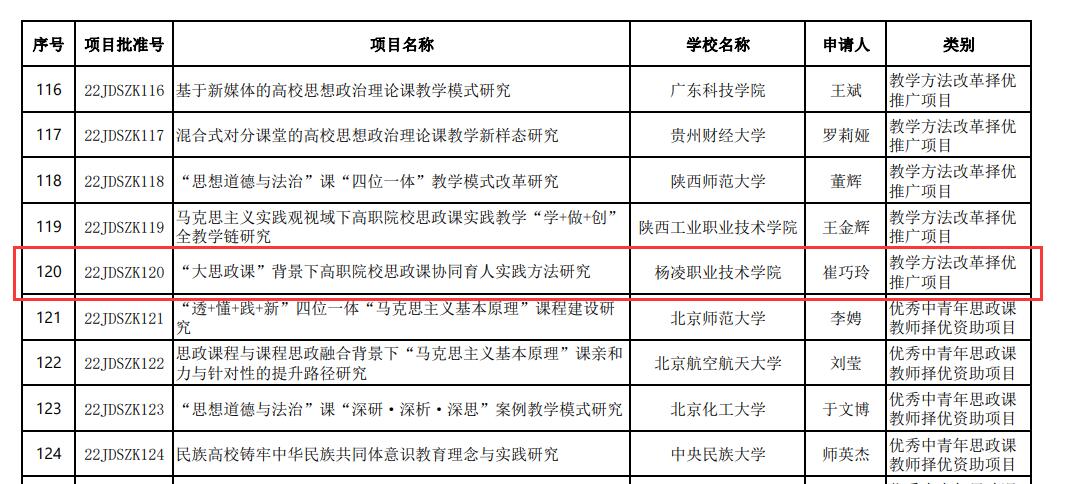 经教育部社科司组织专家严格评审和面向社会公示,2022年度高校思想政治理论课教师研究专项一般项目共有198项批准立项。其中,陕西省共有11个项目获批,崔巧玲主持的项目为全省高职高专两个立项之一。