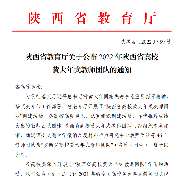 近日,陕西省教育厅、陕西省教科文卫体工会委员会联合发文,公布2022年陕西省师德标兵、师德建设示范团队、黄大年式教师团队和陕西省教育世家名单。我校水利工程学院赵英老师获评陕西省师德标兵,生物工程学院被命名为陕西省师德建设示范团队,动物工程学院畜牧兽医教师团队入选陕西省高校黄大年式教师团队,药物与化工学院刘玉凤家庭获陕西省教育世家荣誉称号。