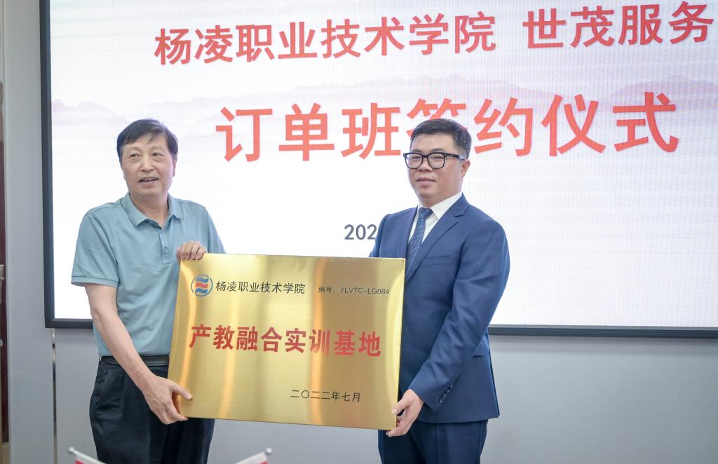 ▲7月28日,我校“世茂服务”订单班签约仪式举行。副校长祝战斌与世茂服务西北中心城市公司总经理周兵代表校企双方签订了订单培养协议,并向企业授予“产教融合实训基地”牌子;周兵向学校授予“现代物业管理专业人才培养基地”牌子;校企双方互聘兼职老师与岗位技能培训师。