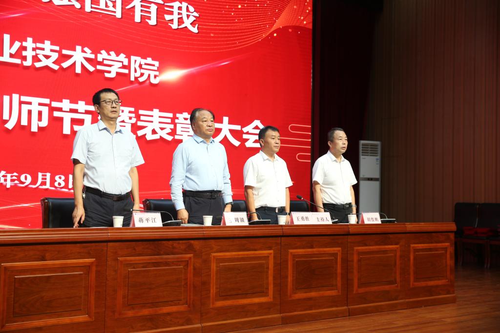 9月8日下午,学校庆祝第39个教师节暨表彰大会在南校区思辨堂举行。学校党委书记王周锁,党委副书记、纪委书记王勇胜,副校长蒋平江、胡俊鹏,受表彰教师代表,各二级学院教师代表,各二级学院(部)党总支书记、院长(主任),机关处室负责人参加了大会。大会由王勇胜主持。