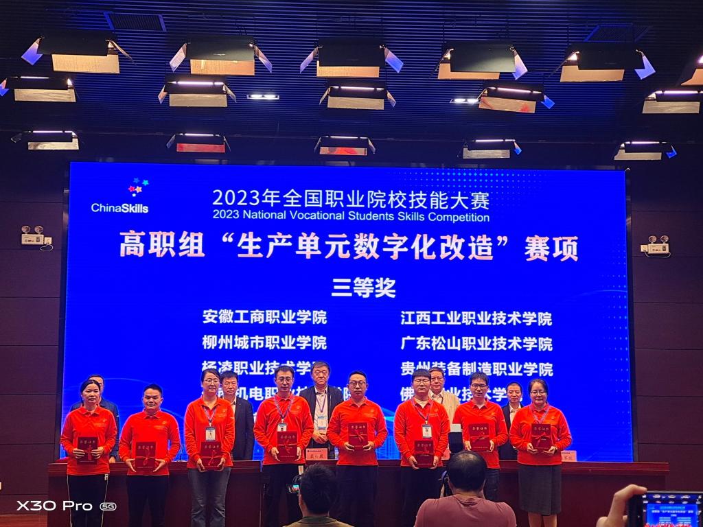 10月11日至13日,2023年全国职业院校技能大赛高职组“生产单元数字化改造(师生同赛)”赛项在天津轻工职业技术学院举办,共有来自全国30个省(市)、自治区的82支代表队、246名选手参加了本次比赛。我校教师李培东和学生李昆伦、南朝辉组成的代表队荣获三等奖。