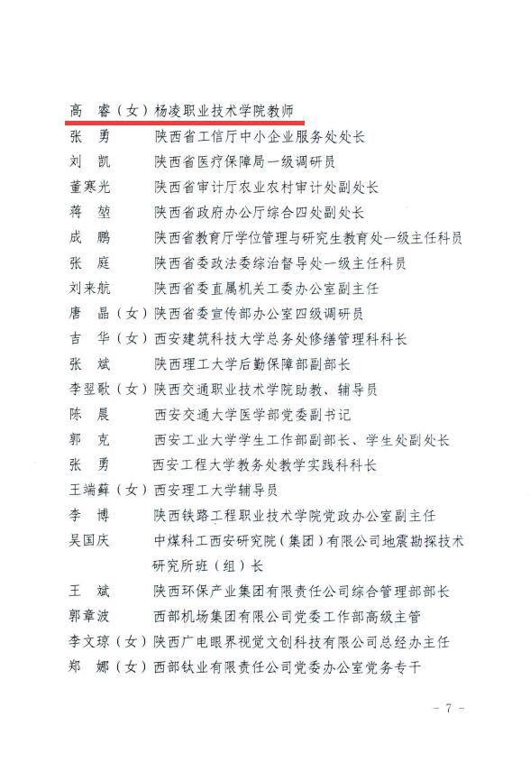 近日,省委宣传部公布2023年度陕西省学雷锋活动示范点和岗位学雷锋标兵名单,杨凌职业技术学院教师高睿荣获“陕西省岗位学雷锋标兵”称号。