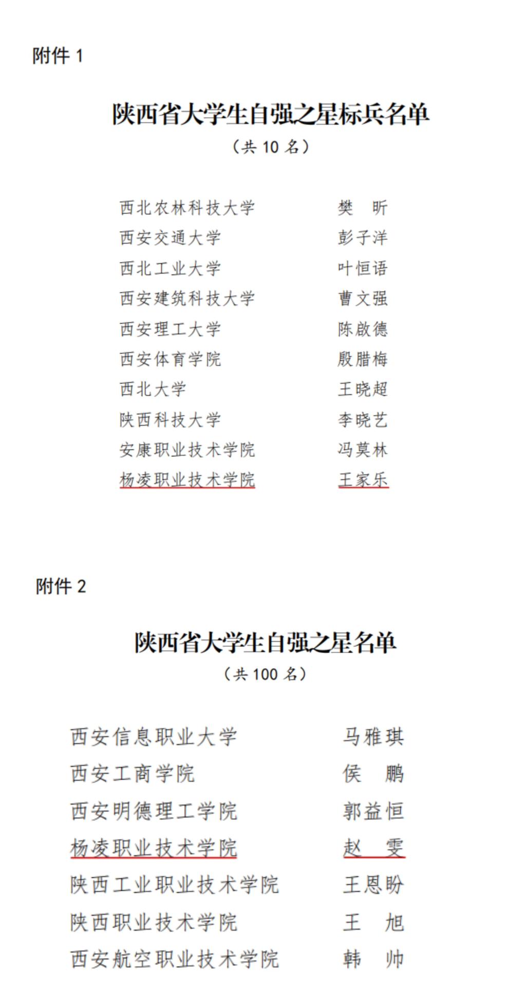 近日,团省委、省学联公布了2023-2024年度陕西省大学生自强之星获奖名单,我校经济与贸易学院学生王家乐荣获“陕西省大学生自强之星标兵”称号,信息工程学院赵雯荣获“陕西省大学生自强之星”荣誉称号。