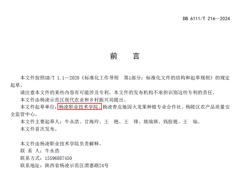 这三项地方标准由杨凌示范区市场监督管理局批准发布,我校教师牛永浩、钱拴提、姚瑞祺、王锋为主要起草人。标准的制定,为北方地区火龙果设施种植产业发展提供了有力的科技支撑,便于我国北方地区火龙果种植户参照管理技术标准,更加科学有效地种植火龙果。
