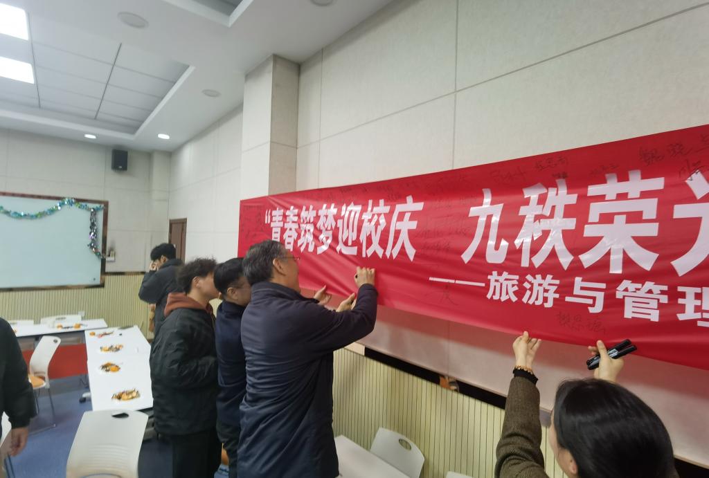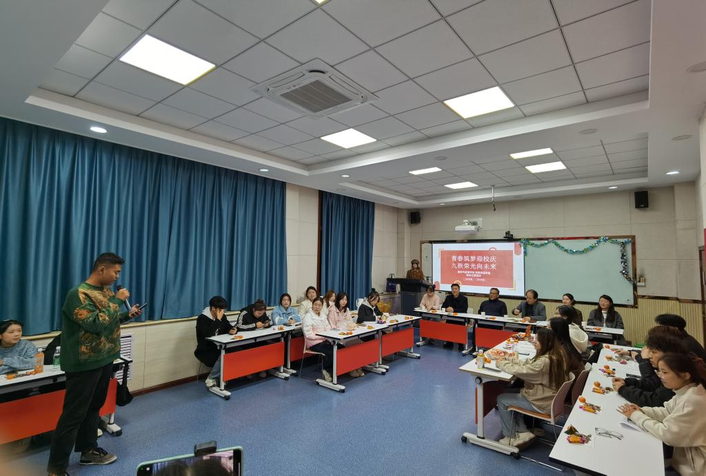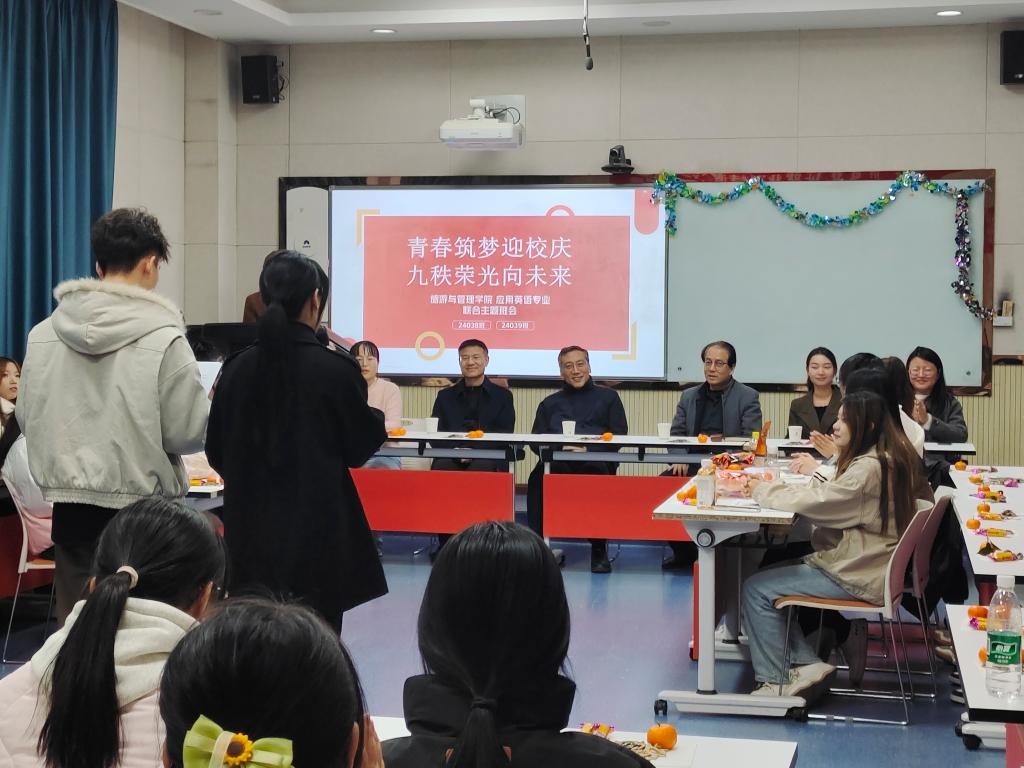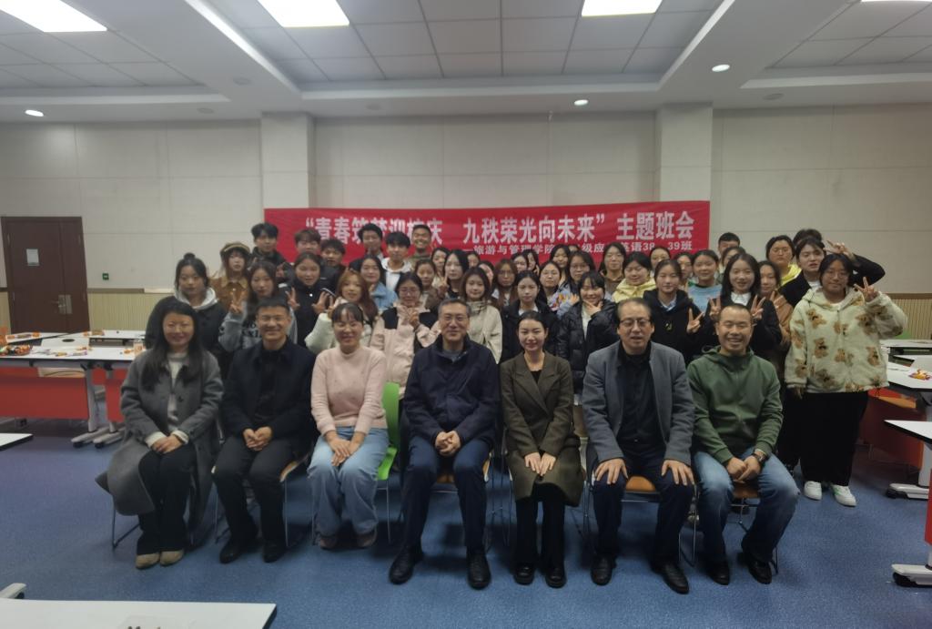 11月26日晚,旅游与管理学院应用英语专业24038班、24039班“青春筑梦迎校庆 九秩荣光向未来”校庆主题班会在北校区举行。学校党委书记韩明军,旅游与管理学院党政负责人参加了主题班会。