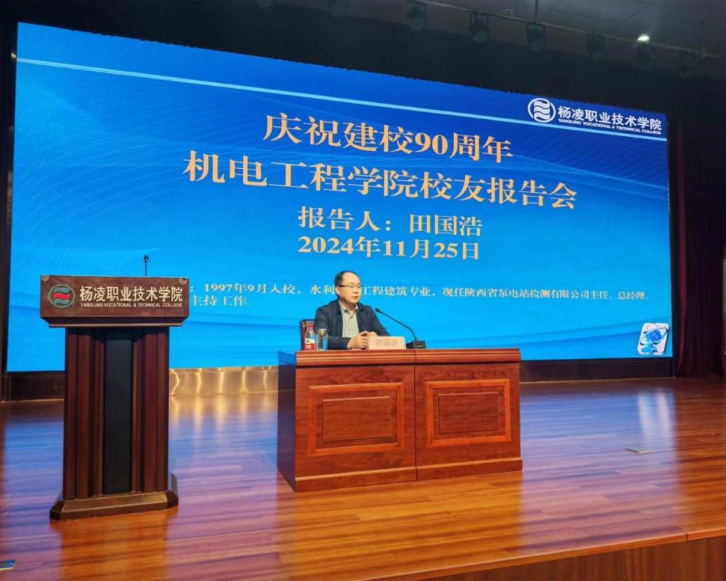 11月25日下午,机电工程学院举办校友报告会,邀请优秀校友、陕西省泵电站检测有限公司主任、总经理田国浩作报告。机电工程学院负责人、教师代表和2023、2024级学生代表近300人聆听报告。报告会上,田国浩结合个人经历和从业认知,以事例详实、内容丰富的报告内容,为机电学子指明了发展方向和目标,激励青年学子奋发读书,紧跟时代步伐,在持续学习中提升个人能力,努力成为一名技能过硬、踏实肯干、发展全面的技术技能型人才,为成就出彩人生努力拼搏。