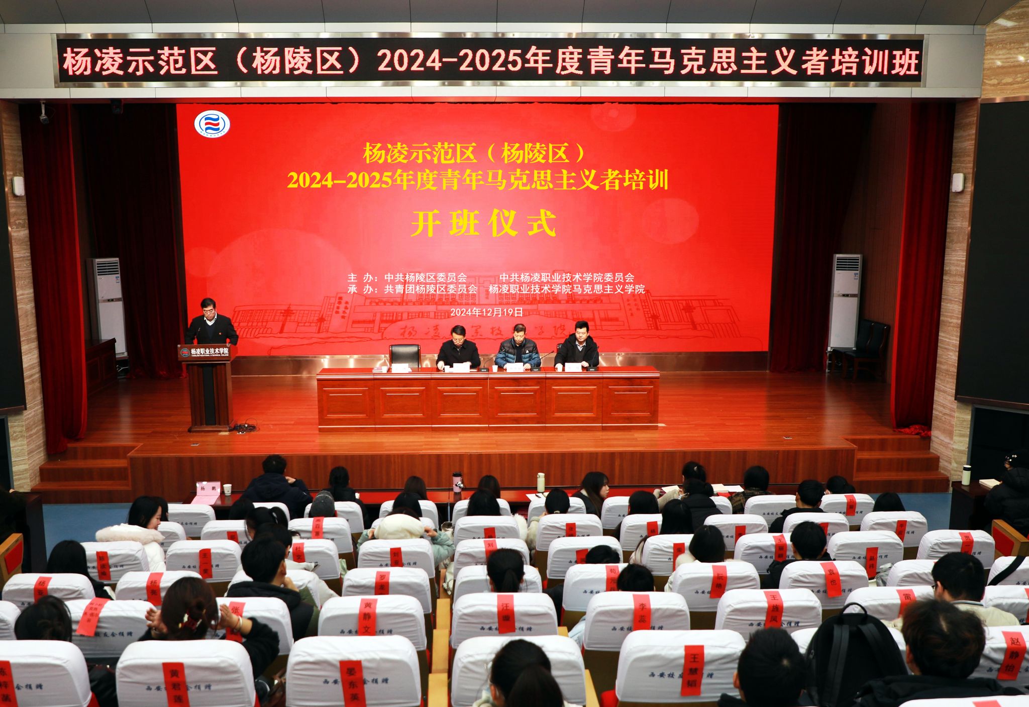 12月19日,2024至2025年度杨凌示范区(杨陵区)青年马克思主义者培训开班仪式在我校举行。副校长祝战斌,杨陵区委副书记李永东出席开班仪式并讲话。马克思主义学院负责人,杨陵区团委负责人及杨凌示范区(杨陵区)各领域80多名优秀青年骨干人才参加开班仪式。