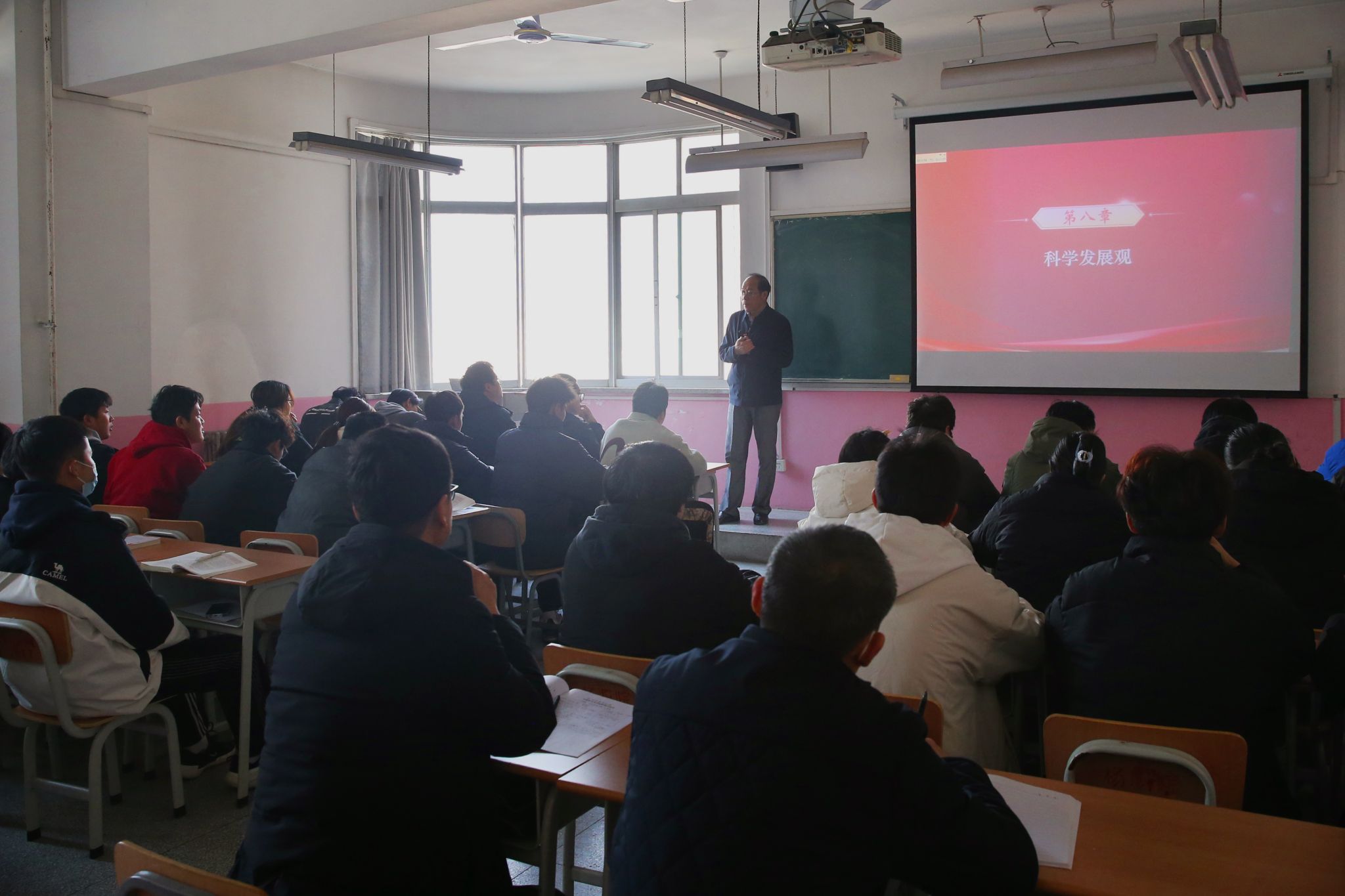 12月25日下午,仲伟周以《毛泽东思想和中国特色社会主义理论体系概论》课程中的科学发展观为授课内容,为机电工程学院工业机器人技术23007班讲授了一堂生动的思政课。讲课过程中,他把思政小课堂同社会大课堂结合起来,立足世界发展大局和中国发展大势,从“粮票”到“移动支付”,从粗放型经济向集约型经济转型,他引经据典,循循善诱,以“小切口”讲解“大主题”,从是什么、为什么、有什么、做什么四个维度深入浅出地讲述了科学发展观的科学内涵、提出背景、主要内容和实践成果,强调了“发展才是硬道理”的深远意义。在和同学的亲切互动中,他勉励大家不忘来时路,珍惜青春韶华和新时代的发展机遇,将个人发展融入国家需要和社会发展中,为强国建设和民族复兴伟业贡献青春力量。