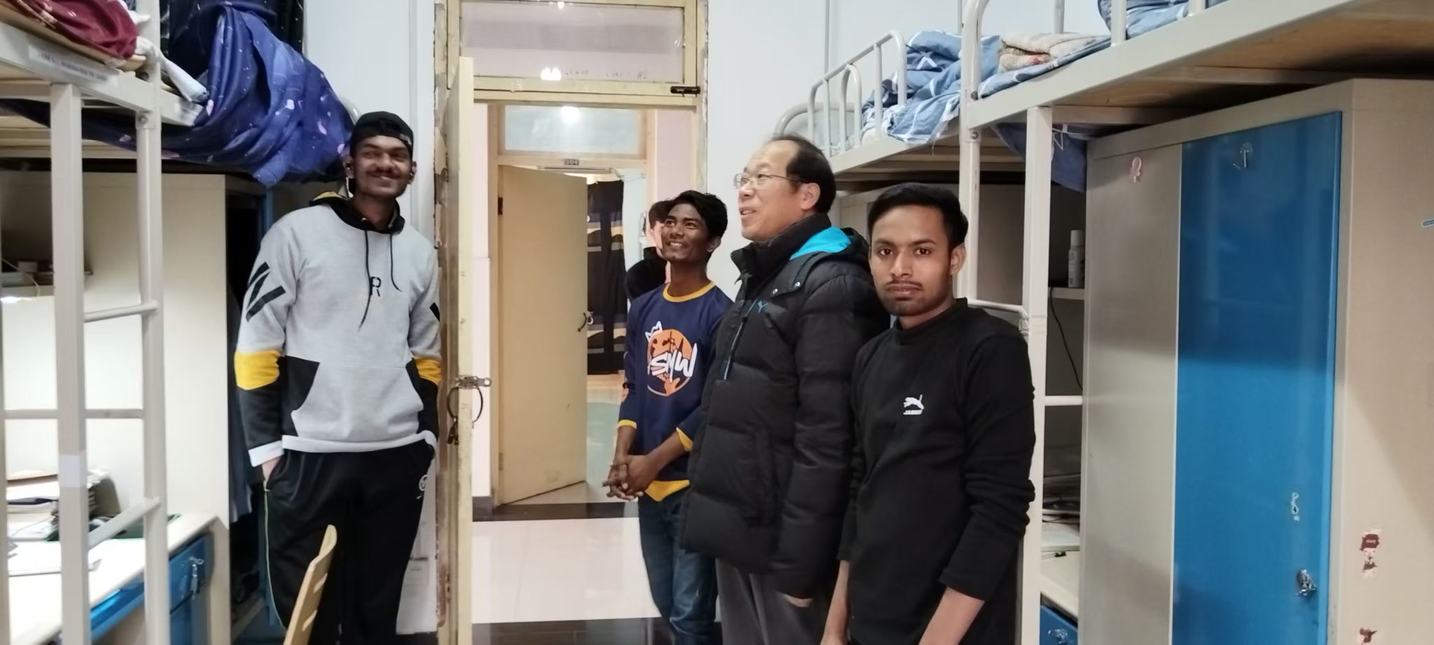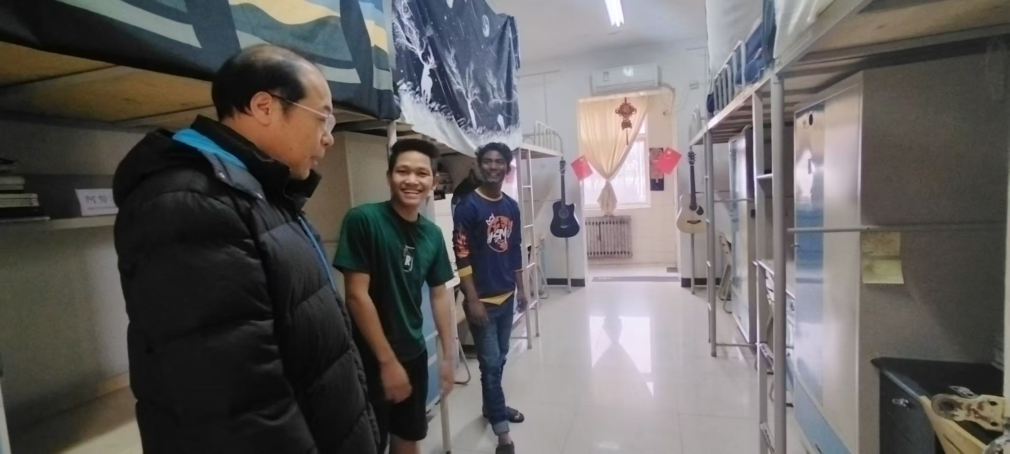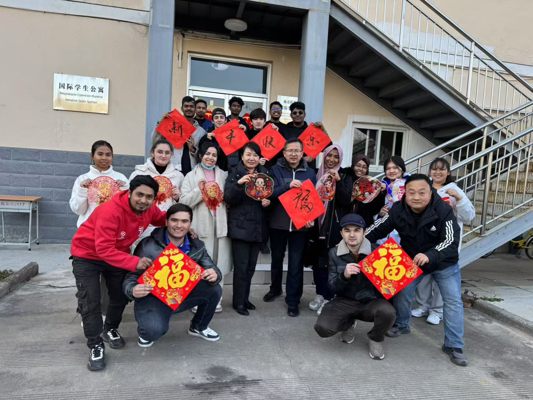 在乙巳蛇年新春佳节来临之际,校长仲伟周、副校长张朝晖先后看望慰问寒假留校的国际留学生。国际合作交流处负责人和工作人员等陪同慰问。