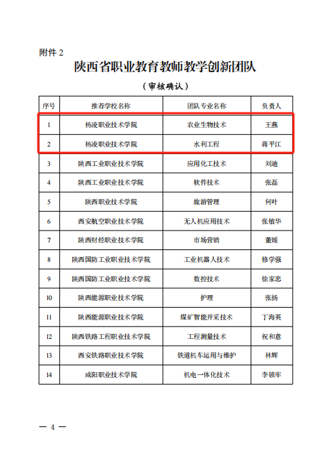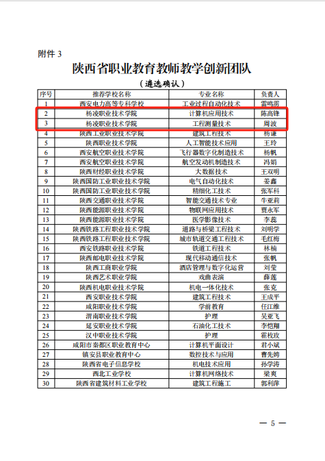 近日,省教育厅公布了省级职业教育教师教学创新团队建设名单。我校衣学慧负责的园林技术、王燕负责的农业生物技术、蒋平江负责的水利工程、陈高锋负责的计算机应用技术和周波负责的工程测量技术等5个专业团队成功入选。