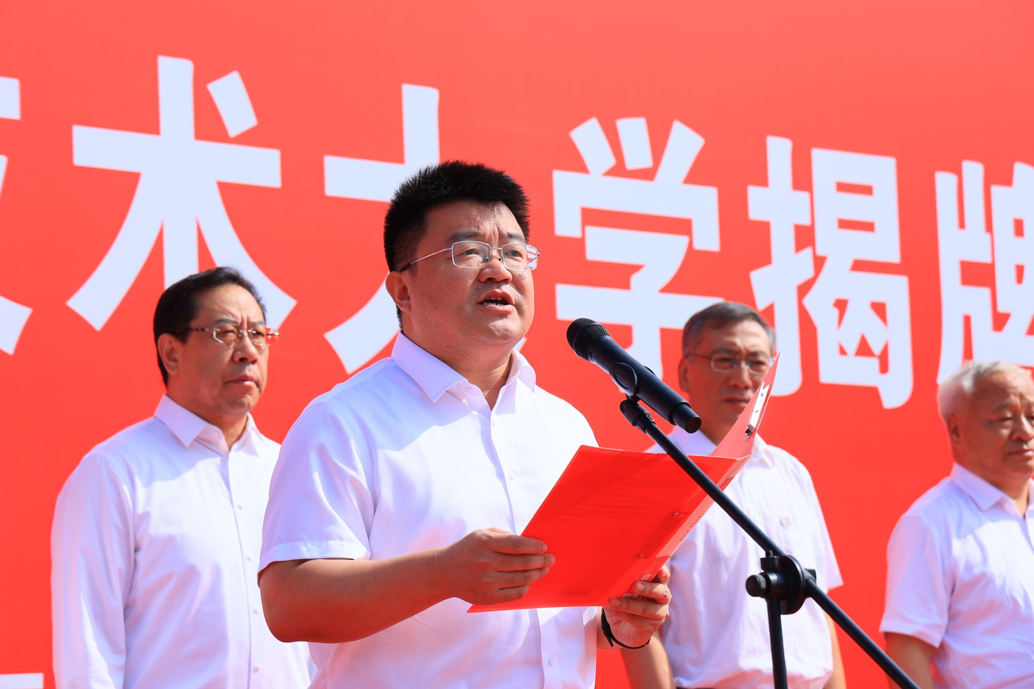 西北农林科技大学党委书记黄思光,杨凌示范区党工委书记史高领,省委教育工委委员、省教育厅副厅长吴振磊,党委书记韩明军共同为学校揭牌