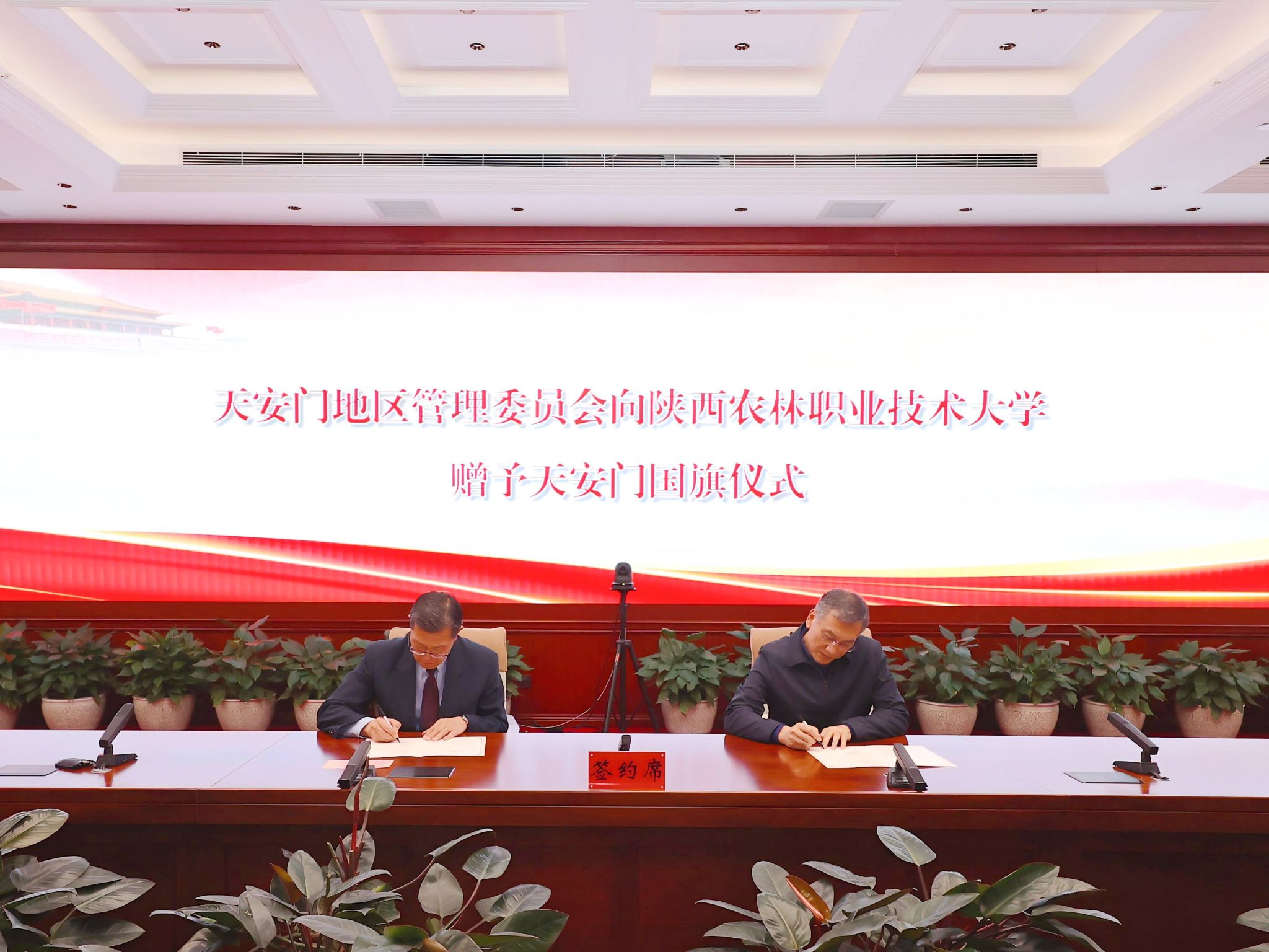 10月31日,北京市人民政府天安门地区管理委员会在天安门地区运行调度中心向陕西农林职业技术大学赠送天安门国旗。天安门地区管理委员会党组成员、副主任姚辉(正局级)向学校赠送国旗,党委书记韩明军代表学校接收国旗,签订了《国旗赠予协议》。学校副校长胡俊鹏、招生就业处、党政办相关同志参加赠旗仪式。