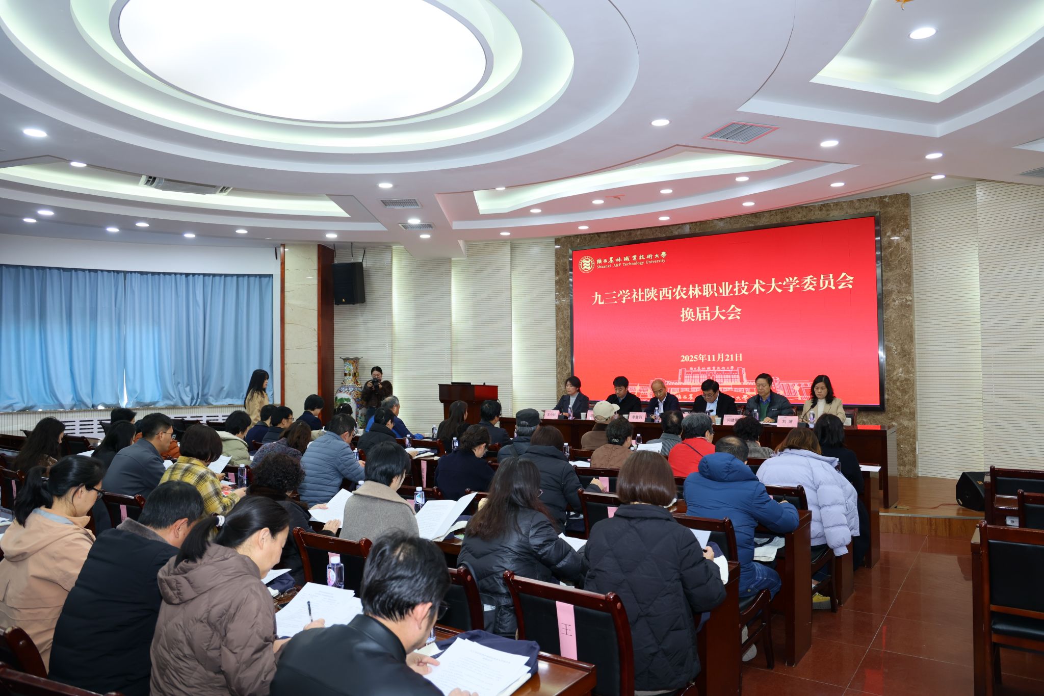 11月21日,学校九三学社委员会召开换届大会。省政协委员、九三学社省委秘书长李胜利,学校党委副书记刘瑞明,九三学社杨凌工委主委王存等出席大会并讲话。党委组织部(统战部)负责人,学校民盟负责同志参加大会。
