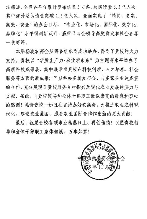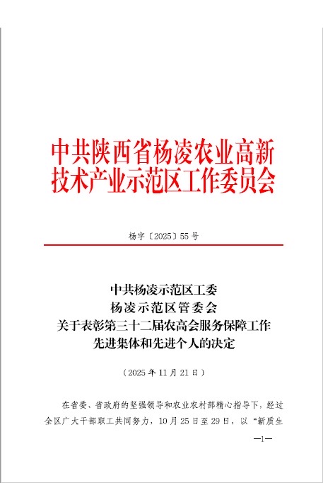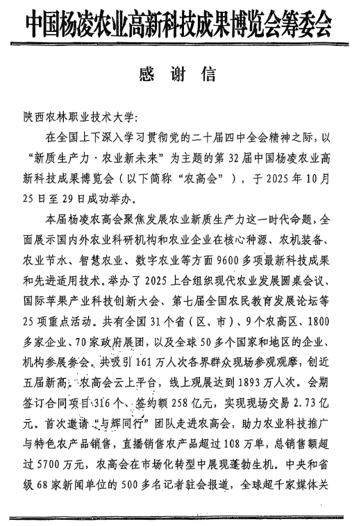 近日,第三十二届中国杨凌农业高新科技成果博览会筹委会向学校发来感谢信,对学校在农高会中的贡献表示高度认可与衷心感谢。同时,中共杨凌示范区工委、杨凌示范区管委会联合发布《关于表彰第三十二届农高会服务保障工作先进集体和先进个人的决定》,学校科技与教育研究处获评“服务保障工作先进集体”,李帅、解晓盈、李垚三位老师获评“服务保障工作先进个人”。