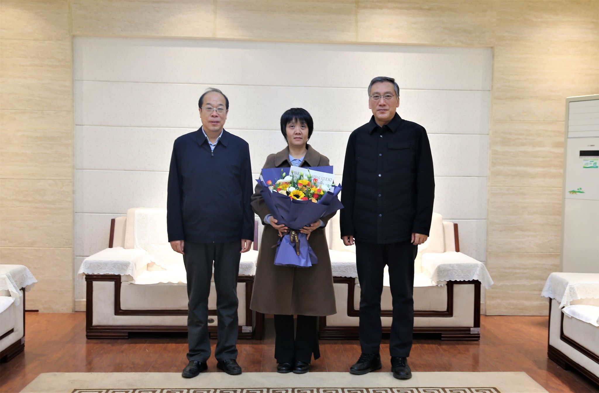 韩明军、仲伟周代表学校向朱显鸽荣获陕西省孝老爱亲道德模范表示祝贺,感谢她为学校精神文明建设作出的贡献。