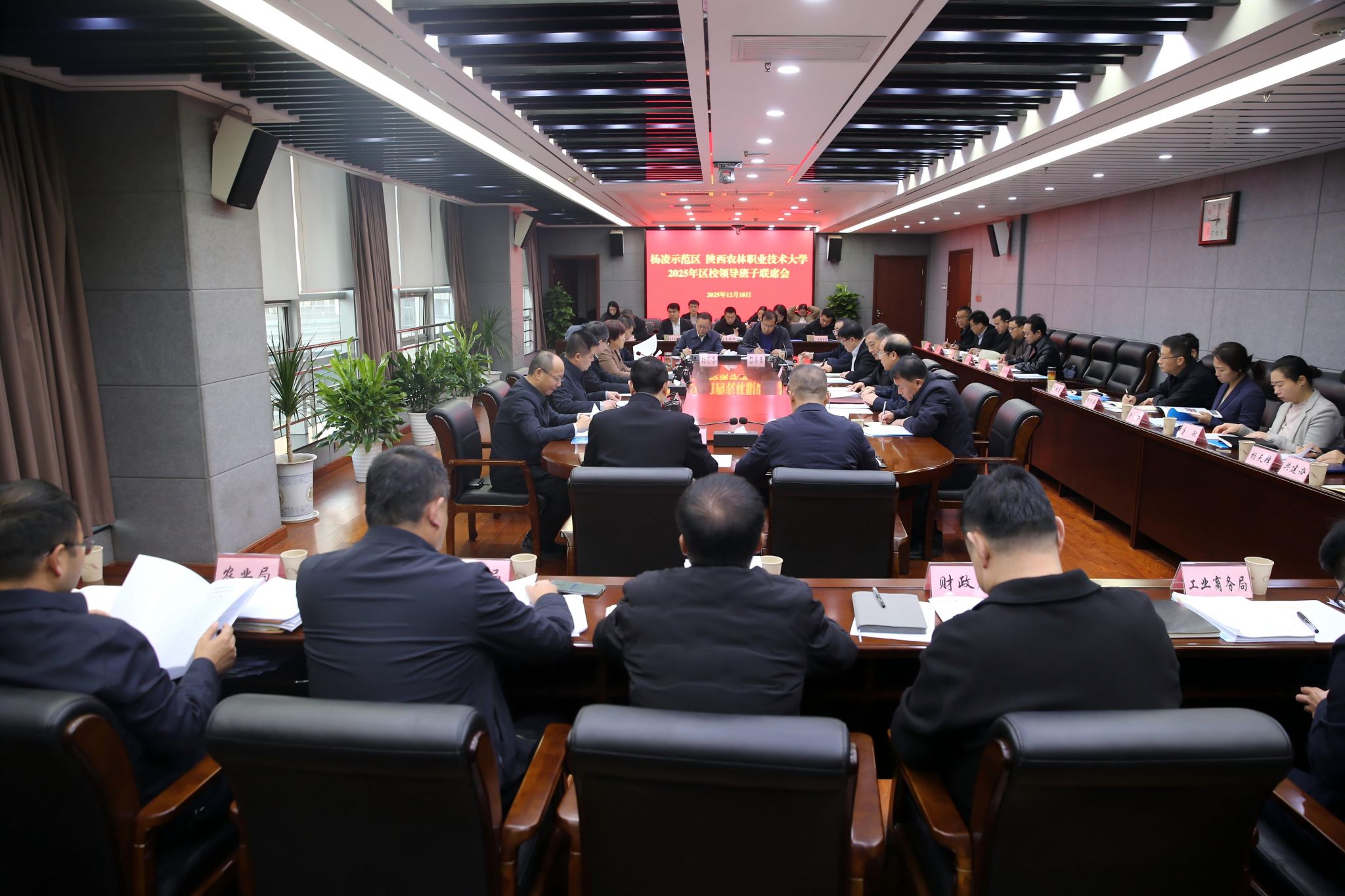 12月18日上午,陕西农林职业技术大学与杨凌示范区领导班子联席会议在示范区政务大厦举行。学校党委书记韩明军,校长仲伟周,党委副书记刘瑞明、王勇胜,党委副书记、纪委书记、监察专员康强,副校长胡俊鹏;杨凌示范区党工委书记史高领,党工委副书记、管委会常务副主任何玲,示范区党工委副书记王军,管委会副主任袁鸿马,示范区党工委组织部长田晓炜等领导出席会议,双方相关部门负责人参加会议。联席会议由何玲主持。