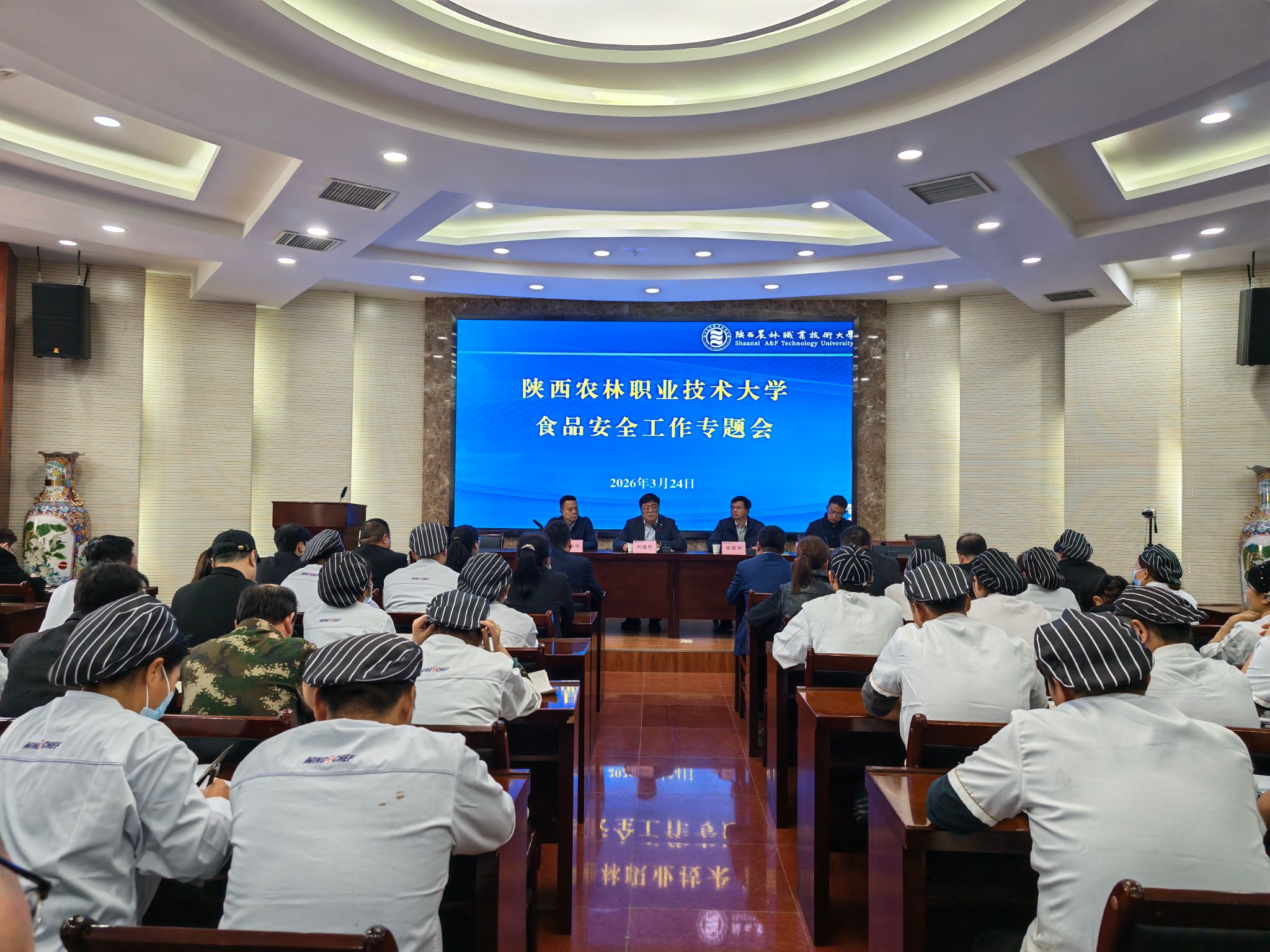 3月24日,学校召开食品安全工作会议暨专题培训会,邀请西北农林科技大学后勤管理服务处副处长卿明华作专题培训。党委副书记刘瑞明出席会议并讲话。后勤保障处负责人、学校食堂食品安全员、库管、三校区食堂餐饮公司负责人、各档口责任人100余人参加会议。