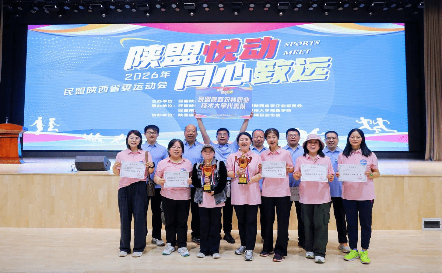 4 月 26 日,民盟陕西省委“陕盟悦动・同心致远”盟员运动会在西安科技大学举办。全省29支民盟基层组织代表队同场竞技、共展风采。我校民盟12名盟员参与欢乐热身跑、拔河友谊赛、跳绳接力赛等项目,斩获拔河友谊赛和跳绳接力赛两项季军。