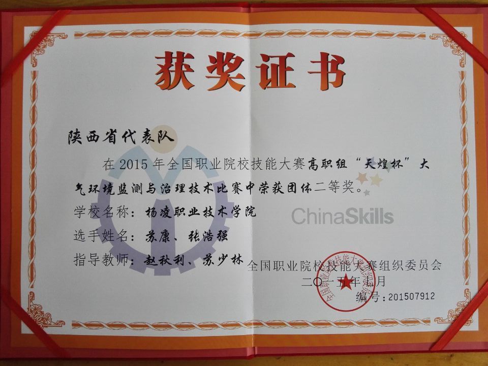 7月4日,由教育部主办的全国职业院校高职组“天煌杯”大气环境监测与治理技术大赛在天津现代职业技术学院闭幕。我院环境监测与治理技术专业13031班苏康、张浩强同学代表陕西省参赛并获得了团体二等奖。