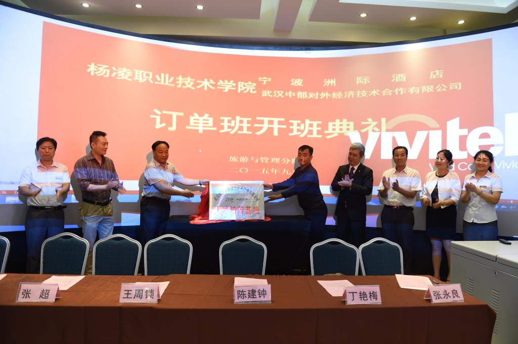 开班仪式上,王周锁与两家企业的负责人共同为“宁波洲际酒店人才培养基地”及“武汉中部对外经济技术合作有限公司人才培养基地” 揭牌。旅游与管理分院负责人汇报了两个订单班的组建情况。