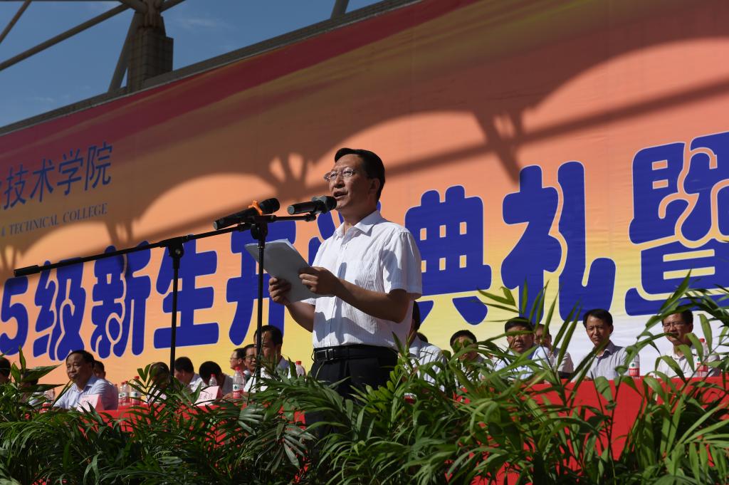 院长王周锁在讲话中首先代表学院党委、行政和全院20000余名师生员工对2015级新同学表示热烈的欢迎,向承担本次军训任务的执训官兵表示崇高的敬意。他简要回顾了学院的发展历程,介绍了近年来学院的发展概况及办学优势,特别是在专业建设、教学改革、校内外实习、实训基地建设等方面取得的成就。
