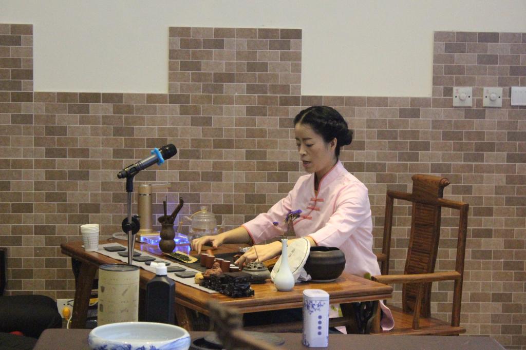 在《高山流水》的优美乐曲中,王晓娟老师身着中国传统古典服装,一边表演茶艺,一边讲解茶文化,大学生深切感受到了中国传统文化的博大精深。随后,李德君老师以新颖的视角讲述书法与茶艺的关系,并从中国书法的演化、文房四宝、书法创作及书法欣赏等方面做了系统的介绍。李老师还现场泼墨,精彩的书法展示赢得了观众的阵阵掌声。讲座内容丰富、形式新颖、艺术氛围浓厚,丰富了大学生校园文化生活,提高了大学生的艺术鉴赏能力。