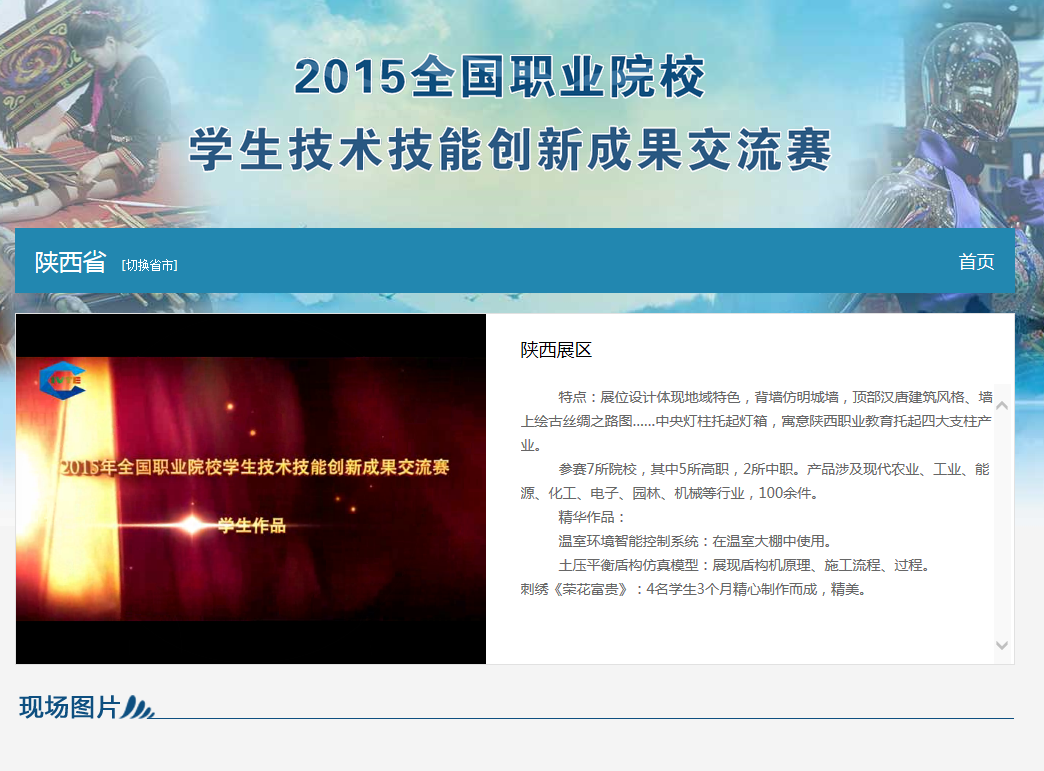 2015全国职业院校学生技术技能创新成果交流赛近日在中国职业教育与成人教育网展示成果,由我院设计建设的陕西展区充分体现地域特色,背墙仿明城墙,顶部汉唐建筑风格、墙上绘古丝绸之路图……中央灯柱托起灯箱,寓意陕西职业教育托起四大支柱产业。