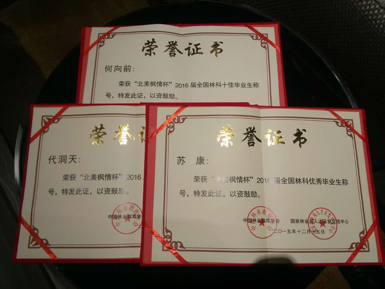 ,由中国林业教育学会和国家林业局人才开发交流中心共同举办的“北美枫情杯”2016届全国林科十佳毕业生评选表彰大会在浙江农林大学举行。生态分院园林规划设计专业何向前同学荣获高职组“全国林科十佳毕业生”称号,林业技术专业代洞天同学和环境监测与治理技术专业苏康同学荣获高职组“全国林科优秀毕业生”称号,李峰博老师荣获全国林科十佳评选优秀组织个人称号。