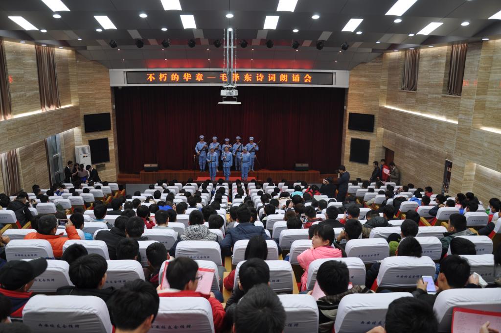 朗诵会开始前,赵曼以“加强实践教学改革,拓展思政教育领域,努力培养合格人才”为题致辞。接下来,从全院选拔出的100多名优秀学生用不同的朗诵形式表达了自己对毛泽东诗词的理解,再次重温了中国社会主义革命和建设走过的光辉历程。最后,王红相老师作了精彩点评。