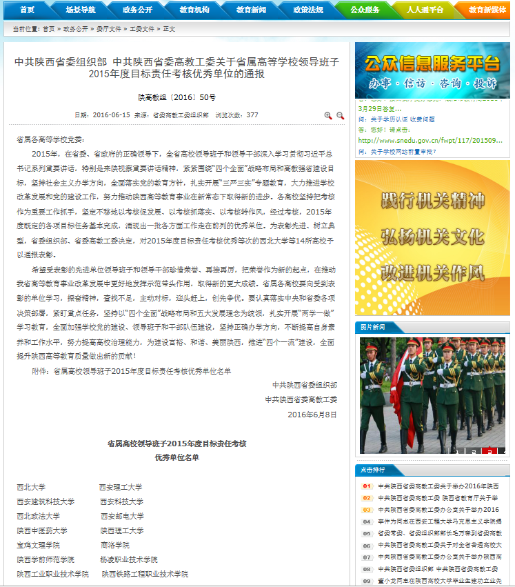 6月8日,省委组织部、省委高教工委对2015年度目标责任考核优秀等次的14所高校予以通报表彰,我院获省属高等学校领导班子2015年度目标责任考核优秀单位。