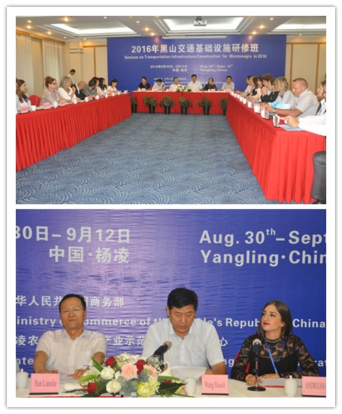 ,由商务部主办,杨凌示范区、华山国际工程公司和我院共同承办的“2016年黑山共和国交通基础设施研修班”在杨凌鑫诚田园山庄酒店举行开班典礼,来自黑山共和国的20名政府部门的官员、技术人员、大学教师与省商务厅领导及管委会有关领导与我院副院长王晓地等参加了本期“研修班”的开班典礼。
