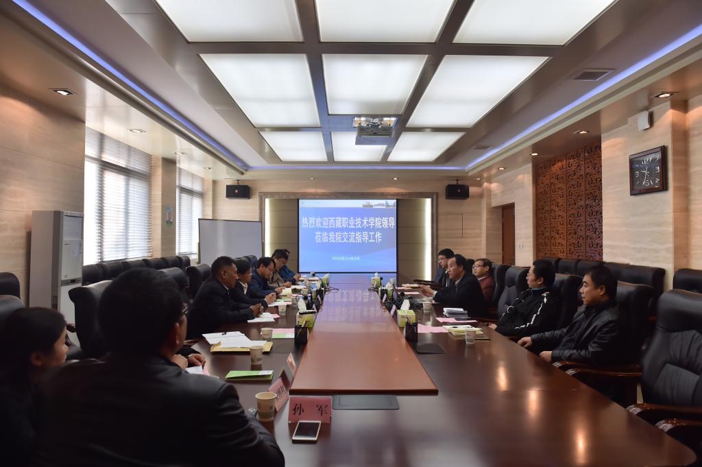 张永良代表学院对兄弟院校来访表示欢迎,并从学院历史沿革、示范建设、“十三五”规划的制定等方面介绍了我院的基本情况。采守宽对学院的热情接待表示感谢,并介绍了西藏职业技术学院近年发展的基本情况。随后,双方就专业结构优化、学生就业、创新创业、百县千企联姻工程、技能大赛、国际化办学等方面进行了深入交流。