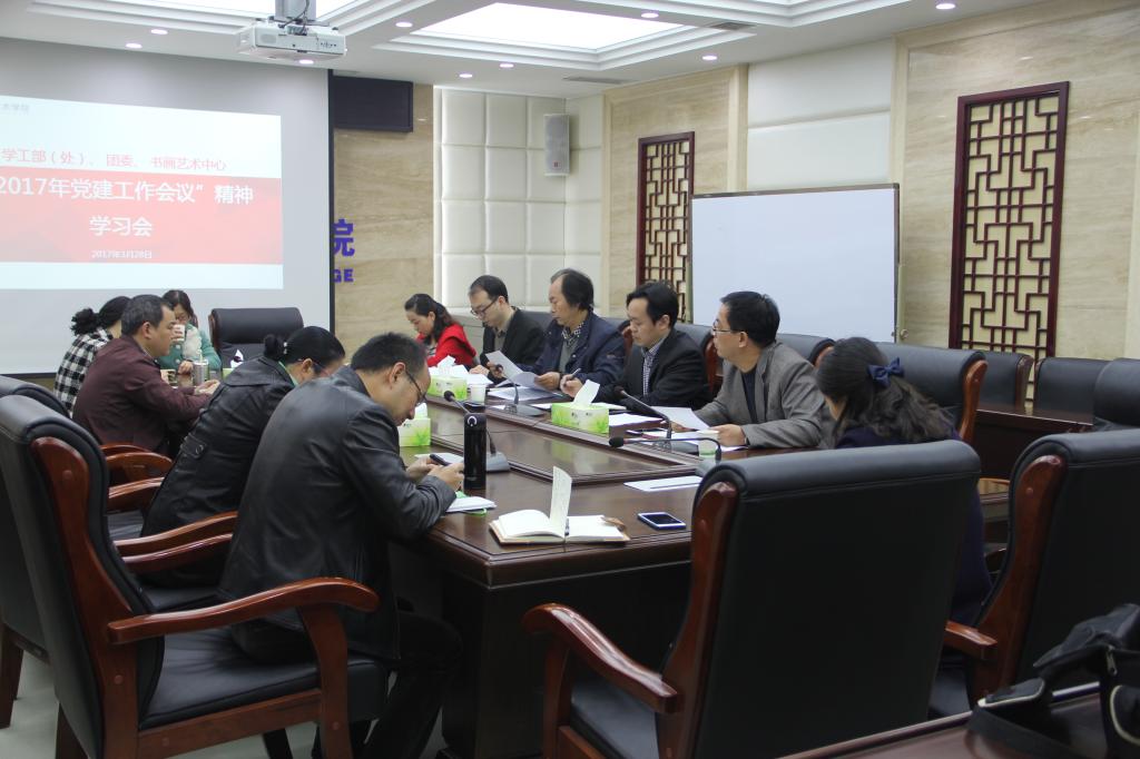 3月28日上午,学生处、书画中心及团委组织所属党员干部召开专题会议,贯彻学习学院党建暨党风廉政建设工作会议精神。所属在家全体党员干部共12人参加会议。会议传达学习了《学院2017年纪检监察工作要点》、学院《2017年党建工作计划》、赵曼书记在党建会议上的讲话。