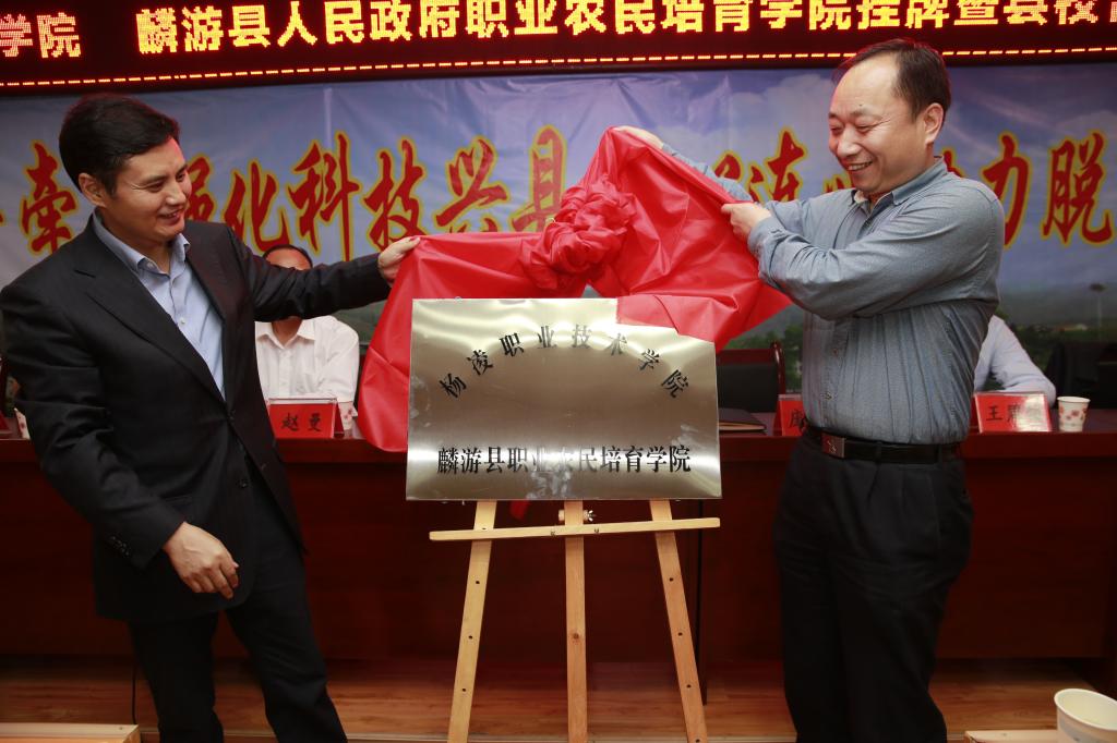 5月25日,我院与麟游县人民政府校县扶贫合作签字仪式暨麟游县职业农民培育学院揭牌仪式在麟游县职业教育中心举行。省农业厅科教处副处长庞怀礼,宝鸡市政府副秘书长陈建平,宝鸡市教育局副局长王伟波,麟游县县委常委、副县长马霄,麟游县副县长刘博彦,以及我院党委书记赵曼、院长王周锁等出席了相关活动。
