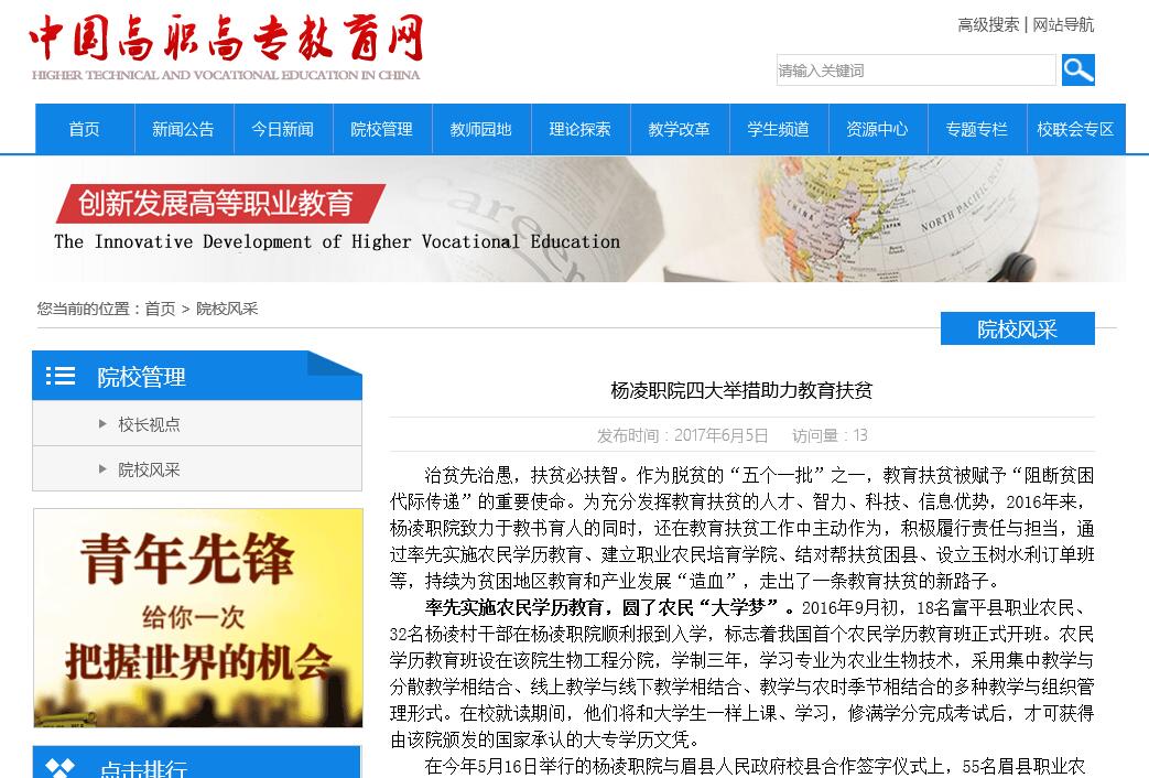 建立职业农民培育学院,让更多农民拥有一技之长。为帮助贫困群众早日脱贫致富,过上好日子,2016年以来,杨凌职院积极探索职业教育办学新模式,先后在陕西富平、杨凌、彬县、洛川、太白和镇坪建立了职业农民培育学院,造就了一批有文化、懂技术、会经营的新型职业农民,使他们成为带领当地农民致富奔小康的“领头羊”。