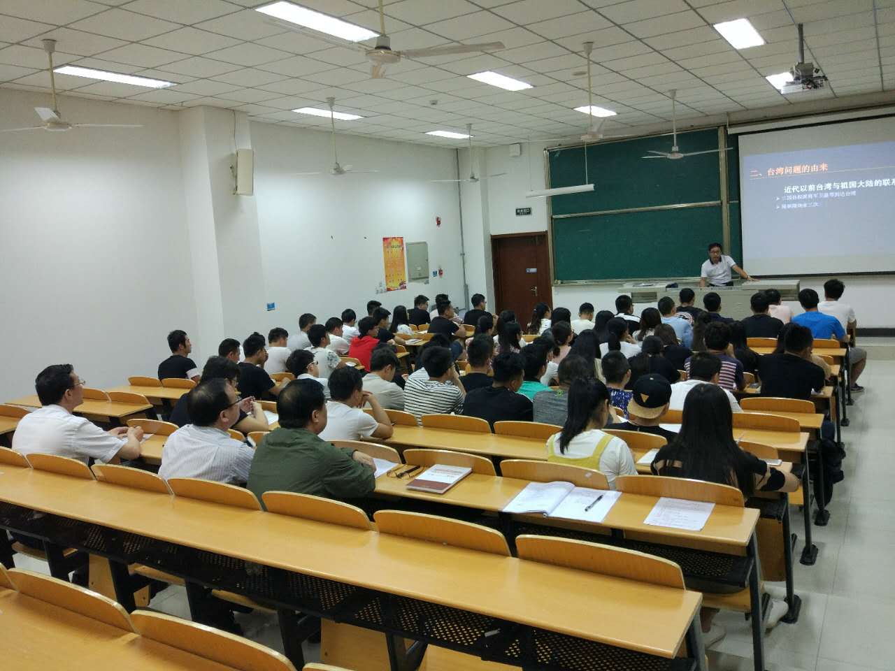 在课堂上,张玉明认真听了思想政治理论教学部马克思主义中国化教研室郭雄伟老师为动工分院畜牧兽医15061、15062、15063三个班百余名大二学生讲授的“解决台湾问题,实现祖国完全统一” 章节,并不时认真做着记录。课间休息时,张玉明对郭雄伟授课的内容、形式、互动等给予了充分肯定,并进行了点评和指导。
