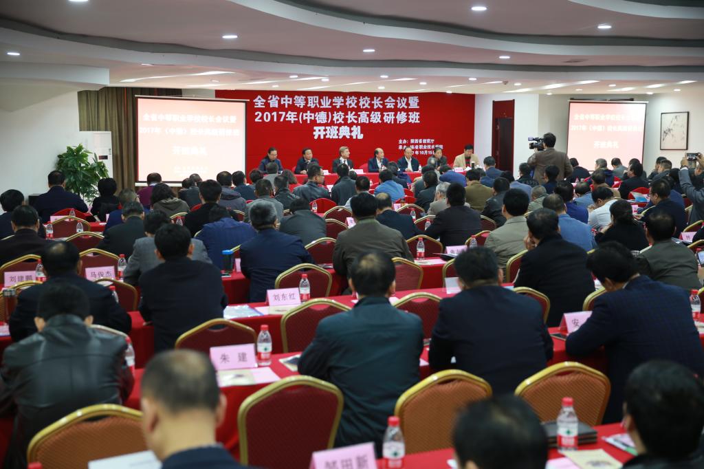 10 月15 日 上午,由陕西省教育厅主办,我院承办的2017年中等职业学校(中德)校长高级研修班开班仪式在我院举行。省教育厅副厅长刘建林、职成处处长韩忠诚,学院党委书记赵曼、院长王周锁、副院长王晓地,德国石荷州首府基尔地区职业教育中心学校校长武尔夫·魏泽西先生参加了研修班开班仪式。开班仪式由韩忠诚主持。