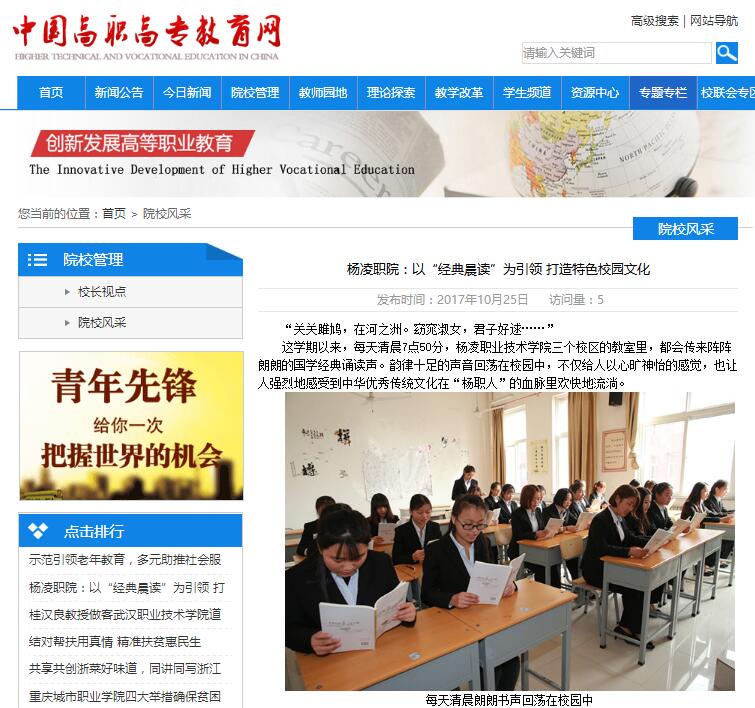 为贯彻全国高校思想政治工作会议精神,用中华优秀经典文化教育培养、感染熏陶学生,丰富立德树人工作内容,坚定师生文化自信,创设培养德才兼备、全面发展的社会主义建设者和接班人的新方式、新方法、新路径和新载体,打造具有学院特色的校园文化。从今年10月9日开始,杨凌职业技术学院启动实施 “中华经典晨读”活动。