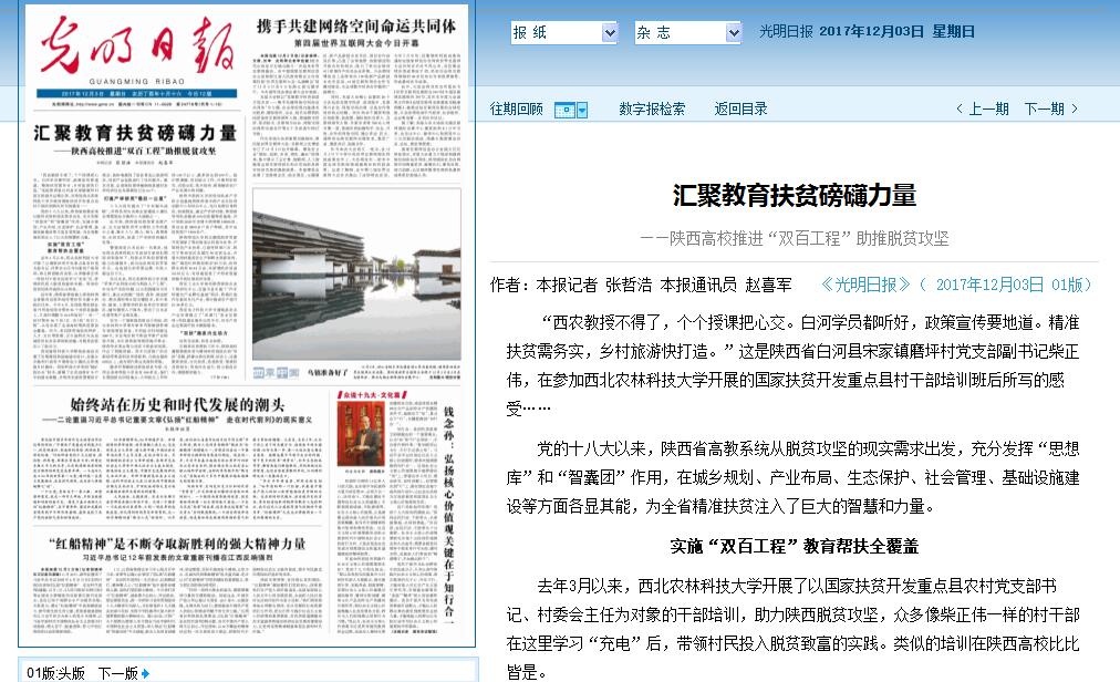 近年来,陕西省委高教工委坚持将全省脱贫攻坚和结对帮扶作为最大的政治任务。今年6月,在原统筹安排全省72所高校结对帮扶56个贫困县基础上,又及时调整为103所高校“一对一”结对帮扶96个县(区、市)的“双百工程”,从而实现了全省高校帮扶贫困县全覆盖。而今,来自陕西高校的科研、人才、文化等资源,正日益转化为各县域经济社会发展的新动能,为脱贫攻坚注入了新活力。