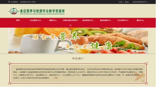 食品营养与检测专业教学资源库项目由我院与重庆医药高等专科学校、江苏农林职业技术学院共同主持,联合国内25所办学实力较强的高职院校、14家国内大型食品营养与检测专业相关行企共同建设,开发建设专业建设中心、课程中心、技能职业培训中心、食品营养中心、食品检测中心、行企信息中心6个中心,覆盖食品营养与检测专业所有主要知识(技能)点,能满足学校教学、企业培训、社会大众普及专业知识的全部需求。