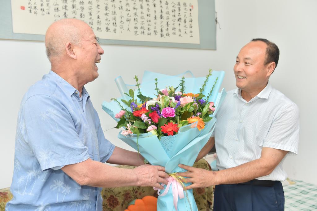 随后,王周锁一行看望慰问了我院离退休教师张四维、胡国俊。在张四维家中,王周锁为他送上了一束鲜花和慰问品,祝他教师节快乐,并希望张四维身体健康,能够继续发挥余热,关心学院发展。在胡国俊家中,王周锁向胡国俊送去了节日的祝福与问候,详细询问了胡国俊的身体以及生活情况,对胡国俊长期以来为学院做出的贡献表示感谢,并嘱咐他多保重身体,继续发挥余热,为学院发展献计献策。