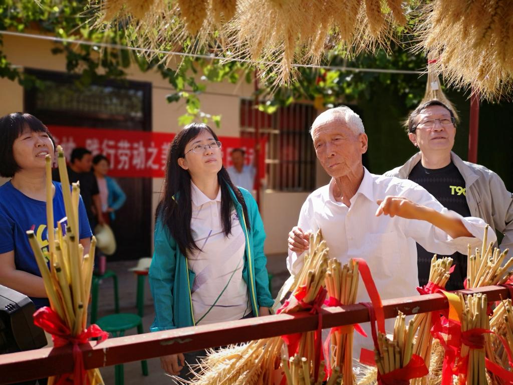 时至芒种节气,我国北方地区小麦正值收割季,育种基地门前广场上已经晾晒了一些麦子。刚一走进育种基地,大家便被挂在铁架上的一把把麦穗吸引,硕大而饱满的麦穗让大家赞不绝口。这是赵瑜研究员从各个小麦品种中精心筛选出的良种,用于育种研究或试验地的播种。在考种室前葡萄架下的阴凉处,大家席地而坐,聆听赵瑜研究员讲述自己六十年如一日,扎根豆村农场辛勤育种的故事。