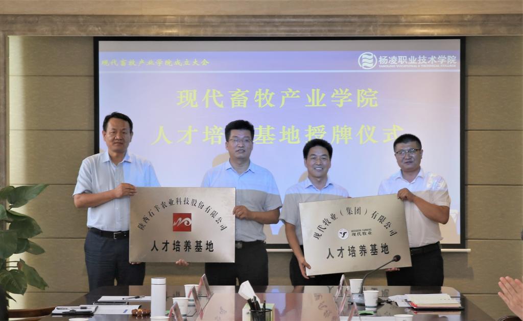 7月15日下午,杨凌职业技术学院“现代畜牧产业学院”成立暨揭牌大会在我院醒钟楼208会议室举行。学院党委书记陈宁、党委副书记任得元、副院长张迪、祝战斌,陕西省畜牧业协会常务副会长、秘书长郭庆宏、猪业分会会长、秘书长张周,陕西石羊农业科技股份有限公司总经理乔冰涛、人力资源总经理常立宏,现代牧业(集团)股份有限公司人力资源总监黎骏驹,现代牧业(宝鸡)有限公司总经理李骁勇等出席了大会。大会由副院长祝战斌主持。