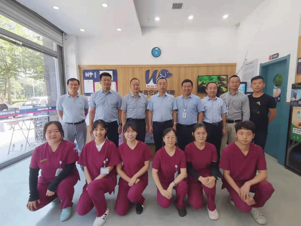 7月7日,副校长胡俊鹏带领科技与教育研究处处长冯旭、动物工程学院副院长张振仓等一行5人赴新瑞鹏宠物医疗集团西安你我它动物医院、西安京和动物医院有限公司走访调研。