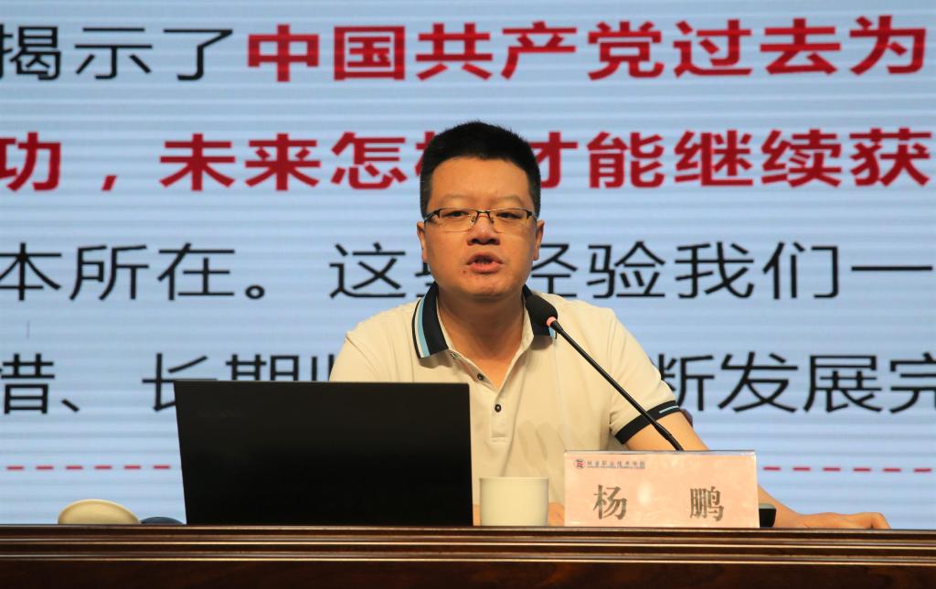 报告会上,杨鹏首先解读了习近平总书记“七一”重要讲话体现出的中国共产党人的四大精神品格:坚定的理想信念、高度的自觉自信、无畏的担当精神、真挚的人民情怀。随后,从三方面阐释了学习习近平总书记“七一”重要讲话的意义:有助于加深我们对中国共产党成立的历史意义和深远影响、有助于加深中国共产党百年奋斗的光辉历史和伟大贡献、有助于加深中国共产党百年奋斗的宝贵经验的认识。最后,从“七一”讲话的主要内容、“七一”讲话提出的一系列新思想新观点新要求对习近平总书记“七一”重要讲话进行了系统梳理。