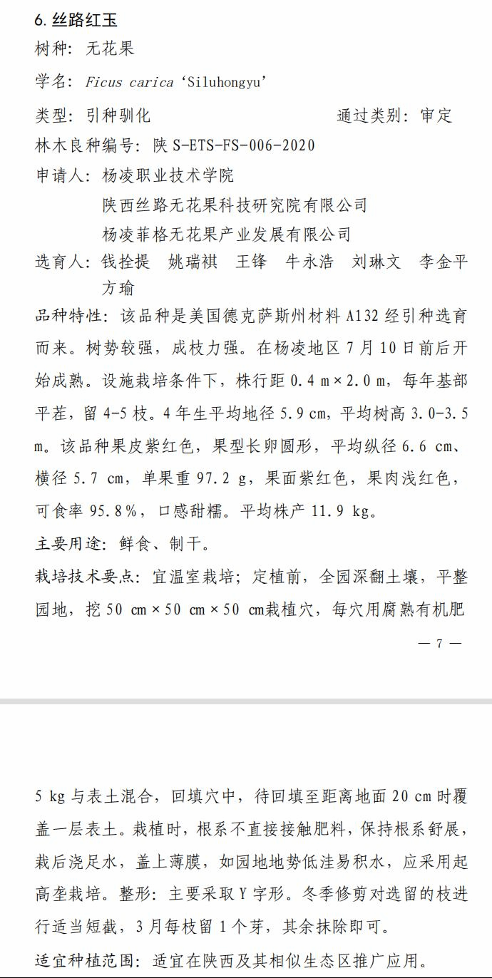 10月27日,陕西省林业局发布了2020年度陕西省林木良种名录,经陕西省林木和草品种审定委员会审定,全省共有33个品种为省级林木良种。由杨凌职业技术学院钱拴提教授团队选育的无花果新品种“丝路红玉”和“丝路黄金”通过省级林木良种审定,这是学校“双高”建设和提质培优行动计划的又一标志性成果。