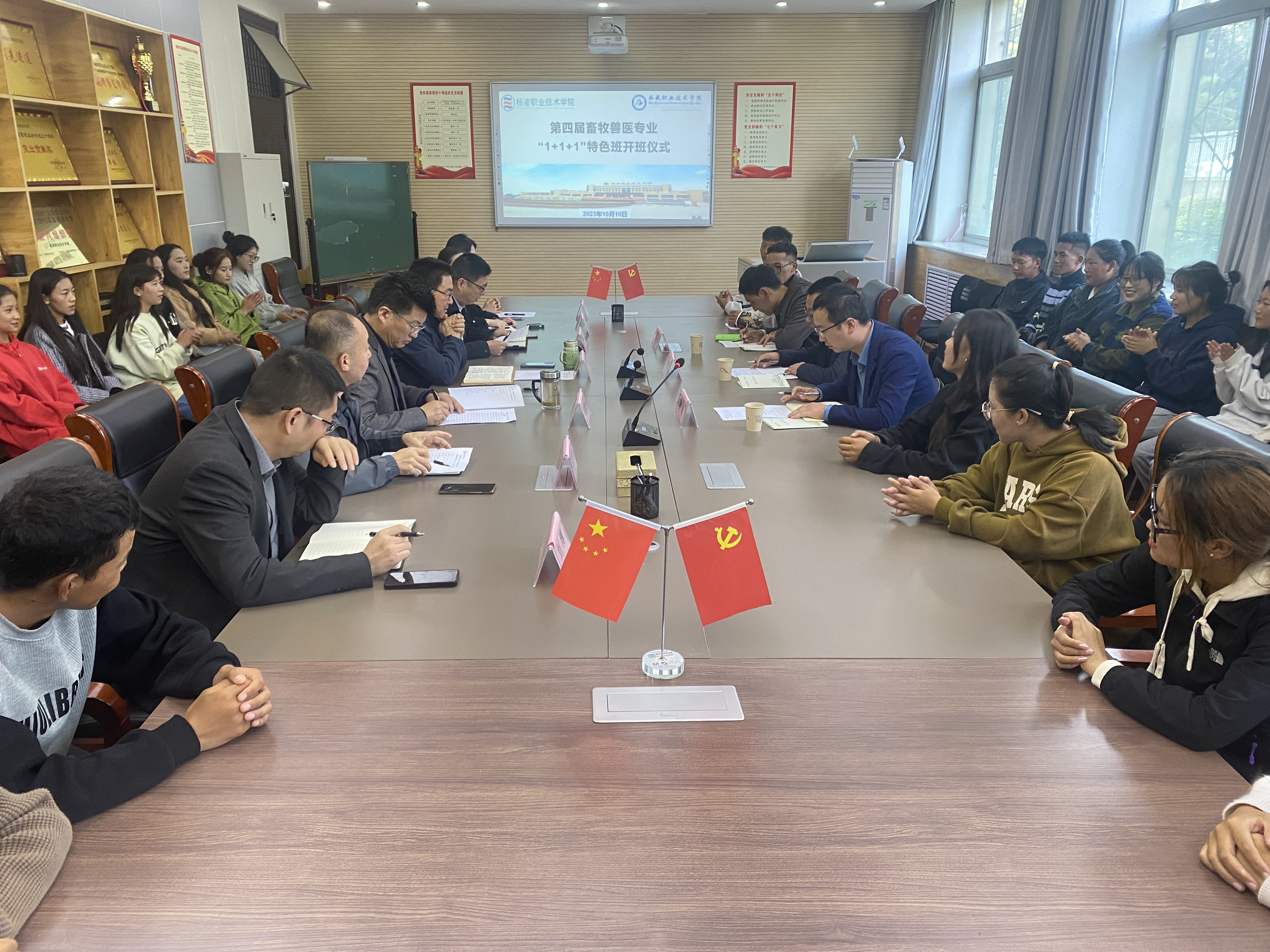 10月10日下午,我校与西藏职业技术学院联合举办的第四届畜牧兽医专业“1+1+1”特色班开班仪式在西校区举行。西藏职业技术学院动物科学技术学院院长刘海聪、教师特旦加措、李鼎,动物工程学院党总支书记张涉、院长张振仓出席开班仪式,教师代表,第四届特色班23名学生参加开班仪式。