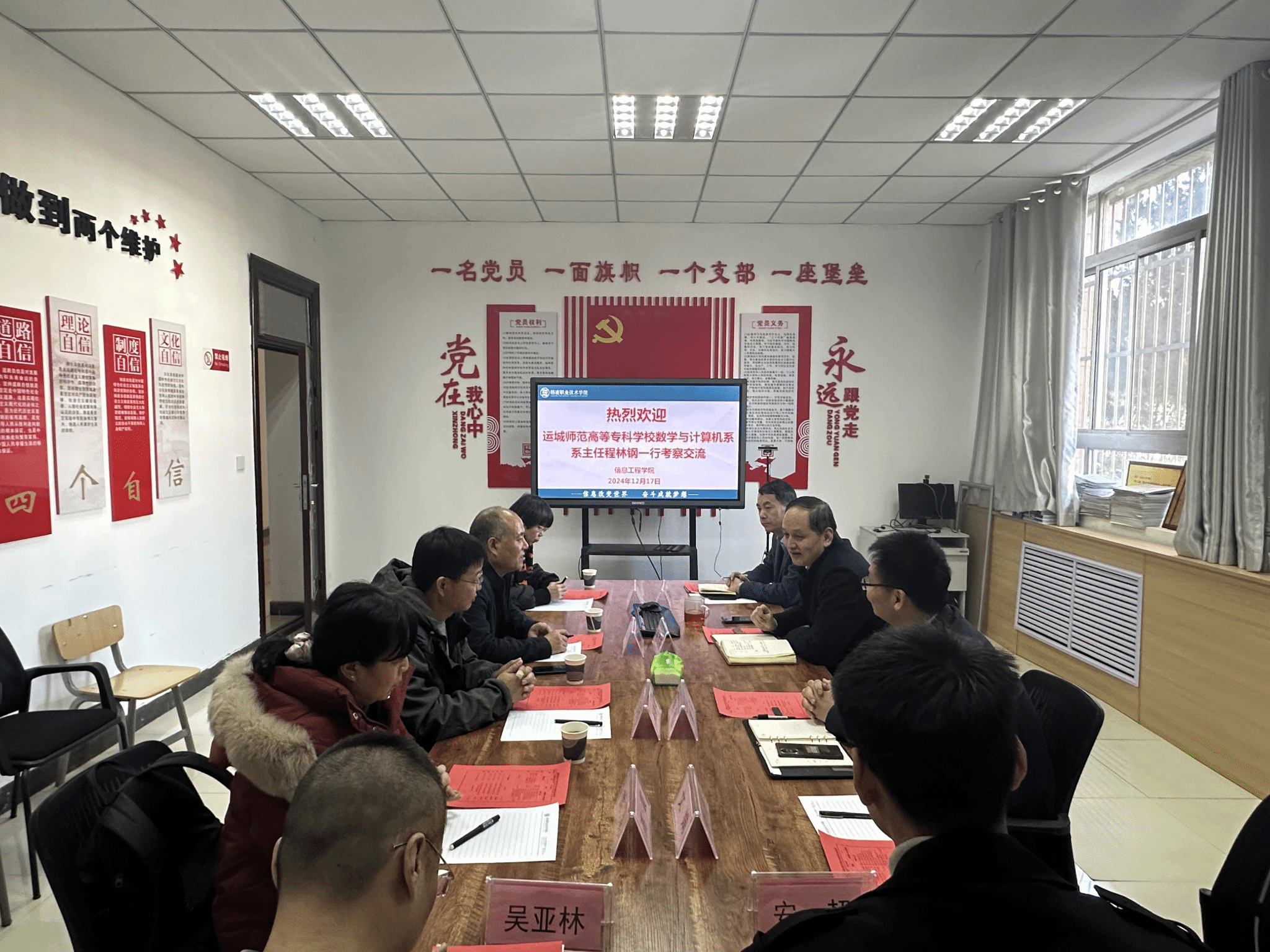 12月17日,运城师范高等专科学校数学与计算机系主任程林钢及系教研室主任解蕾、高霞,华为公司运城代表处总经理安超,深圳市讯方技术股份有限公司山西客户经理吴亚林、陕西高校服务部经理文娟等一行7人来我校考察交流,信息工程学院相关负责人参加座谈。
